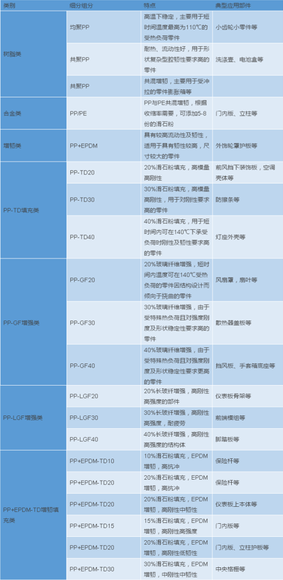 聚丙烯(PP)樹脂是由丙烯單體聚合而成的非極性的結晶類塑料。PP具有價格低廉、密度較小、容易加工和重復利用等優點;但PP具有成型收縮率大、低溫脆性大、易老化等缺點。所以,通常采用物理或化學改性技術,添加滑石粉填充物、玻纖等增強材料、抗光/熱氧老化劑等助劑,提高聚丙烯材料的綜合性能,以滿足汽車部件性能要求。汽車用聚丙烯材料種類、特點及典型部件